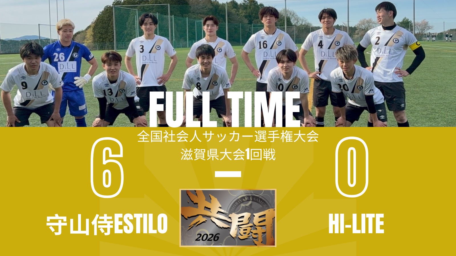 ESTILO公式戦結果。全国社会人サッカー選手権滋賀県大会 1回戦 2026年4月21日 / samurai 4月12日に実施いたしました 守山侍ESTILO公式戦結果です。 第62回全国社会人サッカー選手権滋賀県大会1回戦 vs hi-lite ルネス学園グランド 15:30 kickoff 〇 6 - 0 ( 2 - 0 , 4 - 0 ) ・ 得点経過 8片山(8分)、20杉尾(40分) 24若月宥(65分)、6安部(70分) 9川中(90分)、27久保(90+1分) GAME DATA 過去の投稿へ 【 守山侍2000 試合結果 】 関西サッカーリーグ第1節